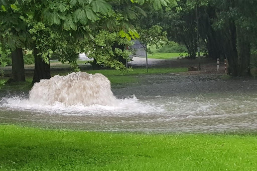 Über die ufer getretene düssel überflutet ostparksiedlung in düsseldorf